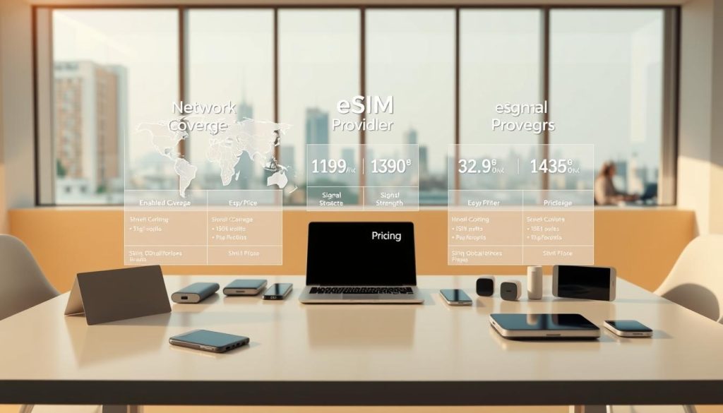 A detailed comparison of eSIM providers against a backdrop of a modern, minimalist office setting. The foreground features a clean, white tabletop with a smartphone, laptop, and various eSIM-enabled devices arranged neatly. The middle ground showcases sleek, geometric visualizations of eSIM network coverage, signal strength, and pricing data, conveying the technical aspects of the comparison. The background hints at a cityscape through large windows, creating a sense of connectivity and technology. Warm, diffused lighting illuminates the scene, creating a professional and sophisticated atmosphere. The overall composition emphasizes the importance of informed decision-making when choosing an eSIM provider for seamless, global connectivity.